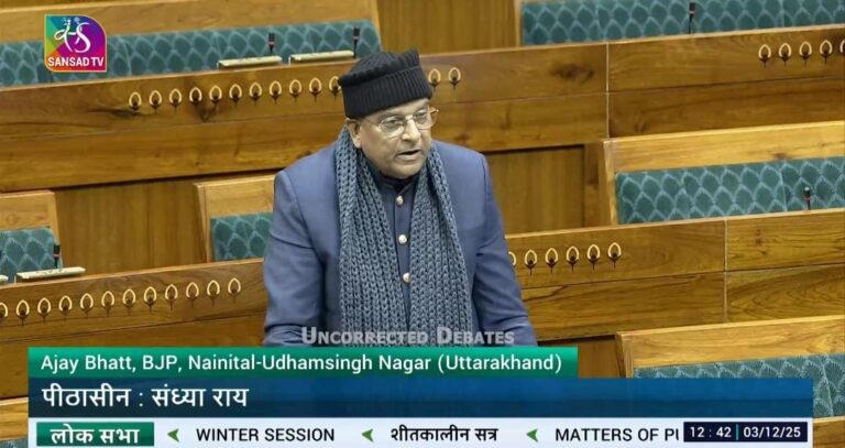 लोकसभा सत्र के दौरान नैनीताल–उधम सिंह नगर से सांसद व पूर्व केंद्रीय राज्य मंत्री अजय भट्ट ने उत्तराखंड के सरकारी अस्पतालों की दयनीय स्थिति और केंद्र द्वारा दिए जा रहे बजट व योजनाओं पर केंद्रीय स्वास्थ्य मंत्री जगत प्रकाश नड्डा से सवाल पूछा।