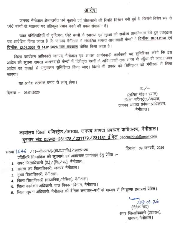 नैनीताल। जनपद नैनीताल में लगातार पड़ रही कड़ाके की ठंड, घने कोहरे और शीतलहर को देखते हुए प्रशासन ने छोटे बच्चों के स्वास्थ्य को ध्यान में रखते हुए बड़ा निर्णय लिया है। जिला प्रशासन द्वारा जारी आदेश के अनुसार जिले में संचालित समस्त आंगनबाड़ी केंद्रों में 10 जनवरी 2026 तथा 12 जनवरी से 14 जनवरी 2026 तक अवकाश घोषित किया गया है। आदेश में कहा गया है कि मौजूदा मौसम की स्थिति से विशेष रूप से छोटे बच्चों के स्वास्थ्य पर प्रतिकूल प्रभाव पड़ने की प्रबल संभावना है। ऐसे में बच्चों की सुरक्षा को सर्वोच्च प्राथमिकता देते हुए यह कदम उठाया गया है जिला कार्यक्रम अधिकारी नैनीताल को निर्देश दिए गए हैं कि वे समस्त आंगनबाड़ी कार्यकर्ताओं के माध्यम से यह सूचना समय से पंजीकृत बच्चों के अभिभावकों तक पहुंचाना सुनिश्चित करें। साथ ही आदेश का कड़ाई से अनुपालन करने के निर्देश दिए गए हैं। किसी भी प्रकार की लापरवाही को गंभीरता से लिया जाएगा प्रशासन के इस निर्णय से अभिभावकों ने राहत की सांस ली है, वहीं मौसम विभाग ने आने वाले दिनों में ठंड और कोहरे की स्थिति बने रहने की संभावना जताई है।