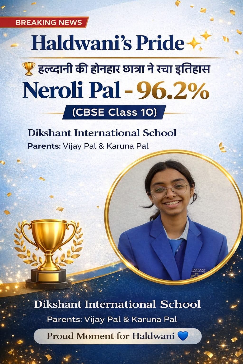 हल्द्वानी की एक होनहार छात्रा ने अपनी मेहनत से 96.2% हासिल कर पुरे शहर का नाम रोशन कर दिया जी हाँ , Dikshant International School की छात्रा Neroli pal ने CBSE 10वीं बोर्ड परीक्षा में 96.2% अंक हासिल कर शानदार सफलता हासिल की है।ये उपलब्धि सिर्फ अंक नहीं, बल्कि मेहनत, अनुशासन और लगातार प्रयासों का नतीजा है। नेरोली के पिता विजय पाल और माता करुणा पाल ने खुशी जताते हुए कहा कि उनकी बेटी ने पूरे समर्पण के साथ पढ़ाई की और आज उसका परिणाम सबके सामने है। स्कूल के टीचर्स ने भी नेरोली की इस उपलब्धि पर गर्व जताया है और उन्हें अन्य छात्रों के लिए प्रेरणा बताया है।नेरोली की सफलता यह दिखाती है कि अगर लक्ष्य स्पष्ट हो और मेहनत सच्ची हो, तो हर सपना पूरा किया जा सकता है।