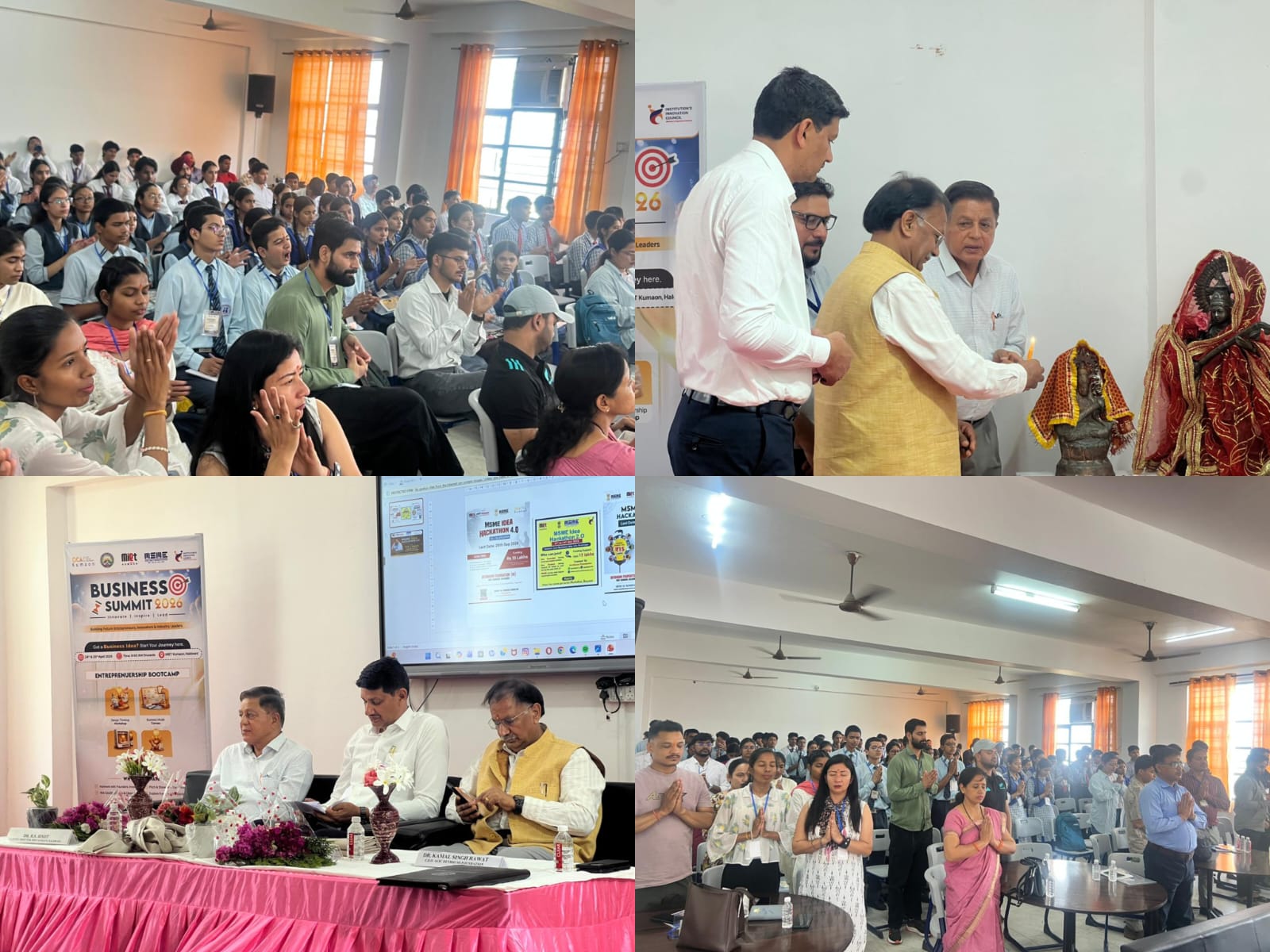 24 अप्रैल 2026 को एमआईईटी कुमाऊँ में आयोजित दो दिवसीय बिजनेस समिट का प्रथम दिवस अत्यंत उत्साह, ज्ञानवर्धक सत्रों और नवाचार से परिपूर्ण रहा। कार्यक्रम का शुभारंभ गरिमामयी उद्घाटन सत्र के साथ हुआ, जिसमें मुख्य अतिथि के रूप में डॉ. प्रो. एन. सी. लोहनी उपस्थित रहे। इस अवसर पर विशिष्ट अतिथि के रूप में यूसीबी के निदेशक डॉ. संजय कुमार ने भी अपनी उपस्थिति दर्ज कराई कार्यक्रम में संस्थान के गणमान्य व्यक्तियों में प्रबंध निदेशक डॉ. बी. एस. बिष्ट, निदेशक डॉ. तरुण कुमार सक्सेना, एसीआईसी देवभूमि फाउंडेशन के सीईओ डॉ. कमल रावत, प्रबंधन विभाग के विभागाध्यक्ष श्री तारा दत्त तिवारी सहित सभी संकाय सदस्य एवं छात्र-छात्राएं उपस्थित रहे उद्घाटन सत्र के पश्चात “उद्यमशील मानसिकता के निर्माण में शैक्षणिक संस्थानों की भूमिका” विषय पर एक प्रभावशाली पैनल चर्चा आयोजित की गई। इस चर्चा में कुमाऊँ विश्वविद्यालय के डीन डॉ. महेंद्र राणा, दून कॉन्वेंट स्कूल के निदेशक श्री पल्लव साह, एमयूवाई के इन्क्यूबेशन मैनेजर श्री दीपक जोशी, एसीआईसी देवभूमि फाउंडेशन के सीईओ डॉ. कमल रावत तथा एसेन्सिस टेक प्राइवेट लिमिटेड के निदेशक डॉ. सुधीर पंत ने अपने विचार साझा किए।